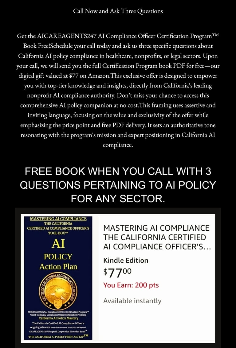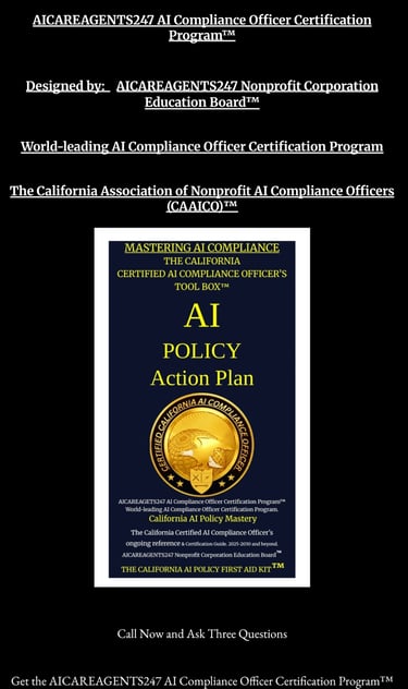 AICAREAGENTS247 is California’s trusted nonprofit leader empowering healthcare providers, nonprofits, and community organizations with expert AI compliance and ethical governance. We provide law-aligned AI Compliance Officer Certification, tailored policy development, training, and mentoring—built to help organizations confidently navigate California’s complex AI regulations under SB 53 and related laws.